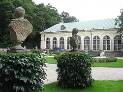 L'ancienne Orangerie a été érigée entre 1786 et 1788[9] en forme de fer à cheval rectangulaire, la façade sud de la structure centrale étant divisée par des pilastres et de grandes fenêtres à arcades. Les ailes adjacentes à l'ouest étaient les quartiers des jardiniers et du personnel. Dans l'aile considérablement plus grande à l'est, un théâtre a été installé avec une entrée au premier étage. En raison de son intérieur richement décoré qui a survécu jusqu'à l'époque moderne, c'est l'un des rares exemples au monde d'un authentique théâtre de cour du XVIIIe siècle[13].