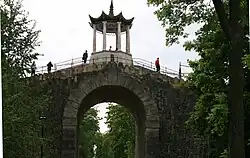 Ce petit pont cruciforme a été construit en 1779 au-dessus du canal. Il est agrémenté en son milieu d'une gloriette chinoise de brique laquée de couleur rouge framboise, jaune et bleue avec de hautes fenêtres vitrées. Le toit pointu est surmonté de boules formant une flèche dans le goût des chinoiseries. Quatre escaliers de vingt-trois marches forment un pont cruciforme.