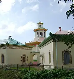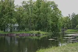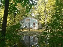 Le pavillon, ou petite maison[3], des enfants se trouve sur un îlot près du palais Alexandre. Il a été construit en 1830 pour les enfants de Nicolas Ier par l'architecte Alexeï Gornostaïev. Il y avait un salon sur toute la largeur et quatre petites chambres[4], et à côté du pavillon, une cuisine construite en bois. Un buste en marbre de l'ancien précepteur de Nicolas Ier, Karl Merder[5], se trouvait devant la petite maison, et à droite un buste en marbre[6] du poète Joukovski qui prit part à l'éducation des enfants impériaux, pour les leçons de littérature et de russe[7]. Les chiens préférés de l'empereur étaient enterrés derrière le pavillon.