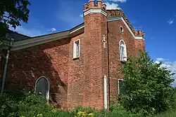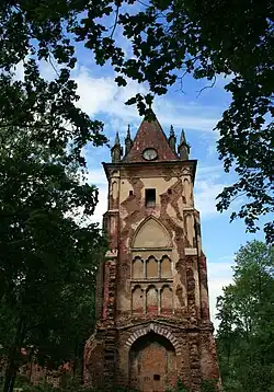 La chapelle (en français dans le texte) est une fabrique néogothique construite en 1828[2] par Menelas sous l'aspect d'une ruine de chapelle romantique allemande rongée par le temps. La chapelle se présente sous la forme de deux tours carrées, dont l'une est à dessein à moitié écroulée, reliées entre elles par un arc. Demut-Malinovski est l'auteur des sculptures (comme celles de la tour blanche). Une statue du Christ, qui se trouve aujourd'hui au musée de l'Ermitage, est commandée par l'impératrice Marie Féodorovna au sculpteur Johann Heinrich von Dannecker.