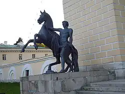 Les grandes écuries ont été construites au bord de la rive gauche du lac supérieur en 1805 et refaites en 1823 par Domenico Gilardi. Elles comprennent les anciennes écuries, magasins à fourrage, et remises pour carrosses, fiacres, landaus et victorias, etc. Deux pavillons d'habitation sont construits de chaque côté qui servaient à accueillir les hôtes de passage et au milieu de la cour, lieu inhabituel pour ce type de bâtiment, on trouve un pavillon de musique[4]. Les usines des Galitzine produisent en 1846 des copies de statues de Klodt, que l'on trouve sur le pont Anitchkov de Saint-Pétersbourg pour orner l'entrée des grandes écuries. Cette partie est aujourd'hui un musée et le pavillon sert de lieu de concert.