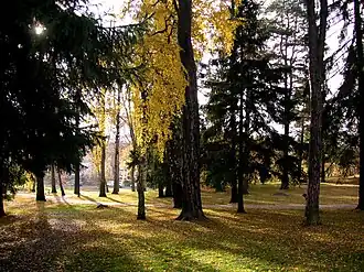 L'herbe sous les grands arbres est luxuriante dans le parc clos. Le soleil brille à travers les pins et les épinettes clairsemés. Dans ce quartier résidentiel calme, la circulation est rare et les grands axes routiers se font entendre faiblement au loin[1].