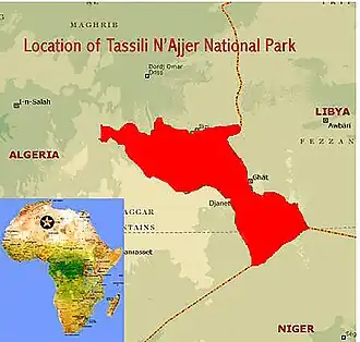 Le parc culturel du Tassili vaste de 138 000 km2, abrite le plateau du Tassili n'Ajjer, haut de plus de 1 000 mètres d'altitude et s'étend sur 50 à 60 km d'est en ouest et 800 km du nord au sud, soit une superficie de près de 72 000 km2[8]. Sur toute sa surface se dressent des formations rocheuses créées par l'érosion émergeant des dunes de sable, qui évoquent de loin les ruines de villes antiques.