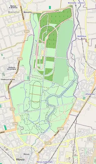 Le parc de Monza est l'un des plus grands parcs urbains historiques d'Europe. L'une de ses principales caractéristiques est qu'il a conservé les murs d'origine de la ville d'environ 14 km. Cette particularité en fait le troisième plus grand parc clos d'Europe après le parc de Chambord avec 32 km[1] et le parc naturel de La Mandria avec ses 30 km[2] Il a une superficie de 732 hectares[3],[4],[5] et est situé au nord de la ville, entre les communes de Monza, Villasanta, Vedano al Lambro et Biassono. Avec les jardins royaux, le parc de Monza constitue un complexe d'une valeur paysagère, historique et architecturale particulière, inclus dans le plus grand parc régional de la vallée du Lambro. Depuis 1922 il abrite l'hippodrome de Mirabello, plus présent aujourd'hui, et un important circuit automobile.