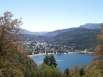 - Villa La Angostura (11 063 habitants[16]), ville située sur la rive nord-ouest du lac Nahuel Huapi (en province de Neuquén), au sud de l'isthme étroit séparant le lac Nahuel Huapi du lac Correntoso, traversé par le court émissaire de ce dernier, le río Correntoso.