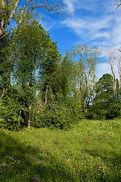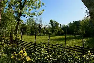 Malgré sa taille, le parc comporte des environnements naturels variés. Près de l'entrée du parc, au sud, se trouvent les prairies, qui sont la principale raison d'existence du parc. Il s'agit d'anciens champs, et de nos jours encore, ils sont entretenus par fauchage au mois d'août[3]. Au printemps et début d'été, ces prairies sont entièrement couvertes de fleurs, dont en particulier l'Ancolie commune (Aquilegia vulgaris), la primevère officinale (Primula veris), l'œillet glauque (Dianthus deltoides), l'orchis mâle (Orchis mascula) ou tacheté (Dactylorhiza maculata subsp. maculata) ainsi que, dans les parties plus humides, la trolle d'Europe (Trollius europaeus) ou la succise des prés (Succisa pratensis)[1]. Ces prairies comportent aussi un certain nombre d'arbres, eux aussi entretenus par élagage, offrant ainsi une image du paysage agricole du XIXe siècle[1].