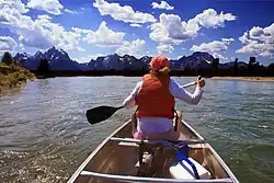 Le parc est situé à l'ouest du Continental Divide. Cette ligne de partage des eaux sépare le bassin hydrographique des cours d'eau se jetant dans l'océan Pacifique de ceux se jetant dans l'océan Atlantique. La rivière Snake, la plus grande du parc, prend sa source au nord de celui-ci dans le parc national de Yellowstone. Il s'agit du principal affluent du fleuve Columbia, qui termine sa course dans l'océan Pacifique[13]. Elle tire son nom, littéralement Rivière Serpent, de son tracé sinueux, long de 1 673 km[14]. Elle entre dans l'aire protégée au niveau de l'important lac Jackson avant de s'écouler dans la vallée de Jackson Hole à l'est du massif de Grand Teton[13].