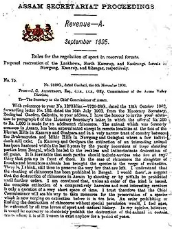 Le parc a été étendu jusqu'aux berges du Brahmapoutre au cours des trois années suivantes, pour une surface de 152 km2. Le classement officiel comme Reserve forest date de 1908.