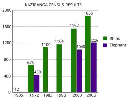 Le parc semble enregistrer un certain succès dans l'augmentation des populations. Kaziranga dénombrait en 2005 quelque 1 206 éléphants de la sous-espèce Elephas maximus indicus, soit 25 % d'augmentation depuis 2002, et 1 666 buffles d'eau en 2001 contre 677 en 1984[21]. Le décompte officiel donne 1 855 rhinocéros en 2006[22], 30 gayals en 1984, 58 sambars en 1999, une centaine de cerfs aboyeurs d'après une estimation faite en se servant du recensement de 1972, 431 sangliers en 1999, et 5 045 cerfs cochon. Les chiffres concernant les tigres portent à controverse ; il en est cependant dénombré 86 en 2006 soit une augmentation de 187 % par rapport aux 30 dénombrés en 1972. Cette zone est donc la plus densément peuplée en tigres du monde et justifie son inscription en tant que Tiger reserve[22]. Par ailleurs il semble que les tigres de ce parc soient plus gros que ceux des autres parcs, l'explication fournie étant que les proies y seraient plus abondantes et mieux nourries, et que cela favoriserait la croissance en taille des tigres[23].