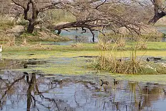 Autour des zones humides, la végétation est composée d'espèces xérophiles et semi-xérophiles principalement, les espèces dominantes sont Acacia nilotica, Prosopis cineraria (en), Salvadora oleoides (en), Capparis decidua and Capparis sepiaria.
