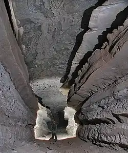 Puis, il y a environ 280 millions d'années, les terres ont émergé. Les forces tectoniques ont alors provoqué au fur et à mesure des déformations du plateau, donnant naissance à de nombreuses fissures entre les couches. Parallèlement, les systèmes fluviaux se mettaient en place et pouvaient alors éroder la roche et se faufiler dans le sol pour creuser des galeries[9],[10]. De nos jours, le système est ainsi composé de galeries qui s'étendent sur plus de 591 kilomètres, chiffre qui est revu à la hausse chaque année au gré des nouvelles découvertes et des connexions.