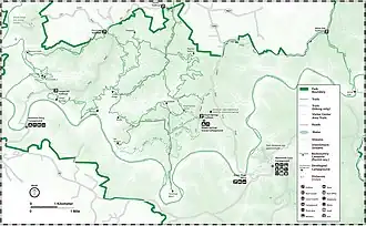 Cette forêt tempérée de caducifoliés est dominée par les chênes (notamment par les chênes blancs, noirs et les châtaigniers), ainsi que par les caryers et quelques hêtres, frênes, érables, tulipiers et genévriers de Virginie[8]. Dans le Nord du parc, des tsugas, des bouleaux jaunes, des magnolias parasols et des houx se développent dans les gorges gréseuses[20].