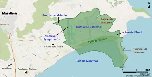 - le marais de Schiniás, sur près de 7 000 hectares, constitue de nos jours la principale zone humide de l'Attique, et ce malgré une étendue considérablement réduite par les aménagements de drainage agricole au cours du XXe siècle[4] ;