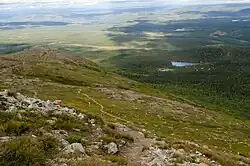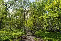 À l'instar de la plupart des Alpes scandinaves, la limite des arbres est formée par les forêts de bouleau tortueux (Betula pubescens subsp. tortuosa)[S 3]. Dans la partie Ouest et Sud, ces forêts sont en général plutôt sèches et pauvres, avec un sol couvert de lichens, tandis qu'au Nord et à l'Est, ainsi que près des ruisseaux, elles sont plus riches et humides[S 3]. Vers les plus basses altitudes, cette forêt se transforme en une forêt de conifères, avec là encore des variations d'humidité[S 3]. Les zones sèches sont dominées par le pin sylvestre (Pinus sylvestris), avec un sol couvert de lichens, de camarine noire et d'airelle rouge (Vaccinium vitis-idaea)[S 3]. Au contraire, les zones plus humides, en particulier sur le versant Nord-Est et dans la vallée de Sododalen sont dominées par l'épicéa commun (Picea abies) avec des sous-bois comprenant entre autres de la myrtille, du solidage verge d'or (Solidago virgaurea), du géranium des bois, de l'épilobe en épi (Chamerion angustifolium), du mélampyre des prés (Melampyrum pratense) et des forêts (Melampyrum sylvaticum), de la trientale d'Europe (Trientalis europaea), du maïanthème à deux feuilles (Maianthemum bifolium) ainsi que des mousses dont la pleurozie dorée (Pleurozium schreberi) et Hylocomium splendens[S 3]. La forêt est particulièrement riche dans la vallée de la Valmen, avec une grande quantité de feuillus se mêlant aux conifères[S 3].
