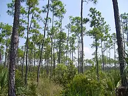 Souvent appelé pinède rocheuse, l'écosystème de la pinède des Everglades est caractérisé par un loam sablonneux, sec et peu profond posé sur un substrat calcaire et couvert presque exclusivement de pins (Pinus elliottii). Les arbres grandissent dans des dolines, où le calcaire fin s'est rempli de terre, permettant aux plantes et aux arbres de pousser[25]. Les pins du sud de la Floride favorisent les incendies par l'existence de lits de séchage des aiguilles de pin et de l'excrétion d'écorce sèche. Ce qui rentre naturellement dans un cycle biologique, puisque leurs pommes ont besoin de la chaleur du feu pour s'ouvrir et disperser leurs graines. Cependant, le corps de ces pins est résistant au feu, et c'est pourquoi des incendies contrôlés sont provoqués tous les trois à sept ans dans ces zones[26]. La plupart des plantes de la zone fleurit environ 16 semaines après un incendie[27].