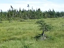 Le parc comprend les trois-quarts de la taïga de l'île, un milieu situé à plus de 400 mètres d'altitude, caractérisé par des halliers, des landes rocailleuses et de grandes tourbières humides[27]. Selon une théorie, la forêt boréale couvrait autrefois tout le plateau, mais à la suite d'un feu de forêt vers la fin du XVIIIe siècle ou plus tôt, le sapin baumier n'aurait pas pu repousser à cause du climat et du sol pauvre. La végétation actuelle, plus adaptée à ce milieu, serait alors apparue[27]. L'arbre le plus fréquent est l'épinette noire, certains sont âgés de 150 ans tout en ne dépassant pas un mètre de haut[27]. Les arbres sont déformés à cause du verglas, de la poudrerie (chasse-neige élevé), du sol mince, des températures extrêmes et de la courte période de croissance[27]. Certains arbres forment même des krummholz, c'est-à-dire qu'ils poussent uniquement au niveau du sol[27]. Les végétaux les plus courants des landes sont le bleuet à feuilles étroites (Vaccinium angustifolium), la kalmia à feuilles étroites (Kalmia angustifolia) et le lichen à caribou (Cladonia rangiferina). Les tourbières sont peuplées par la shaigne, la linaigrette (Eriophorum sp.), les joncs, les orchidées, l'airelle, le thé du Labrador (Rhododendron groenlandicum) et quelques plantes carnivores comme la sarracénie pourpre (Sarracenia purpurea) et le droséra (Drosera)[27].