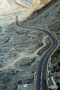 Depuis 1986 la route du Karakorum (construite par l'armée pakistanaise dans les années 1960 et 1970) est la seule route traversant le massif et permettant, d'une part, un accès au Xinjiang voisin par le col de Khunjerab (4693m) et, d'autre part, l'accès à la capitale régionale Gilgit puis de relier la région aux plaines fertiles du pays. C'est donc un accès stratégique à plusieurs niveaux ; 810 Pakistanais et environ 200 Chinois sont morts durant la construction de la route des deux côtés de la frontière[5].