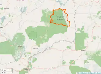 Le parc national s'étend sur 416 512 ha ; il est limité au Nord par la rivière Migiri (21,5 km), la rivière Miyere (11,2 km), la rivière Mdjerem (16,4 km) et la rivière Malo (17,8 km) ; à l'Est par la rivière Merou (91,2 km) ; au Sud par la rivière Mdjerem (21,5 km), les rivières Mekie et Mehe (42,2 km), Mbi (40 km), Ngomsi (13,2 km) et la route Yoko-Sangbe ; à l'Ouest par la route Yoko-Sangbe (4 km), la rivière Sui (12,4 km), deux cours d'eau non dénommés de (11,4 km) et (9 km) respectivement, les rivières Meré (2,8 km) et Mfou (14,5 km), Beboun (15,8 km) ; la piste Sangbé vers Gongotoua (8,8 km)[1].