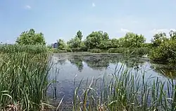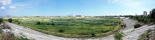 Vue du parc naturel de Văcărești devant des bâtiments résidentiels à Bucarest. | |