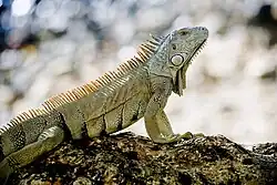 L'Iguane des petites Antilles (Iguana delicatissima) est endémique de la Martinique, de la Guadeloupe, de Saint-martin et de quelques îles plus petites. Cette espèce est considérée comme vulnérable par l' UICN, elle est menacée entre autres par l'hybridation avec Iguana iguana, l'Iguane vert, une espèce exotique envahissante en Martinique. Bien qu'aucun cas n'ai été répertorié sur cette île en particulier, il a longtemps été chassé pour la consommation humaine.