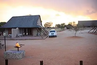 Il y a 4 chalets de 2 couchages chacun, faits de sacs de sable et de toile, avec chambre, ventilateur de plafond, salle de bains et cuisine sur la véranda. Ils sont meublés (vaisselle, couverts, draps, frigidaire et (braai?). L'un des chalets est aménagé pour les handicapés. Une cuisine et un barbecue communs sont disponibles. L'eau chaude et la cuisine sont au gaz, l'éclairage est fourni par des panneaux solaires[1]. - Camp pour tentes du Kalahari (Kalahari Tented Camp[1]).