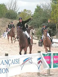 - ↑ Tétière : pièce de cuir du bridon passant derrière les oreilles du cheval au niveau de la nuque
