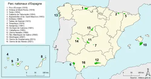 Au nombre de seize[3], le premier parc national déclaré est le parc national des pics d'Europe, créé en 1918[4] et le dernier est le parc national de la Sierra de las Nieves en 2021[5].