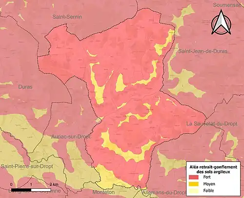Le retrait-gonflement des sols argileux est susceptible d'engendrer des dommages importants aux bâtiments en cas d’alternance de périodes de sécheresse et de pluie[19]. La totalité de la commune est en aléa moyen ou fort (91,8 % au niveau départemental et 48,5 % au niveau national)[Carte 2]. Depuis le , en application de la loi ELAN, différentes contraintes s'imposent aux vendeurs, maîtres d'ouvrages ou constructeurs de biens situés dans une zone classée en aléa moyen ou fort[Note 1],[20].