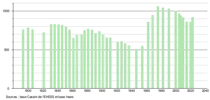 - ↑ Population municipale de référence en vigueur au 1er janvier 2025, millésimée 2022, définie dans les limites territoriales en vigueur au 1er janvier 2024, date de référence statistique : 1er janvier 2022.