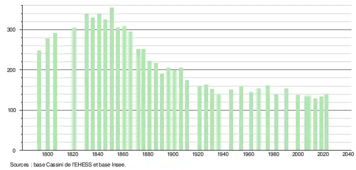 L'évolution du nombre d'habitants est connue à travers les recensements de la population effectués dans la commune depuis 1793. Pour les communes de moins de 10 000 habitants, une enquête de recensement portant sur toute la population est réalisée tous les cinq ans, les populations de référence des années intermédiaires étant quant à elles estimées par interpolation ou extrapolation[19]. Pour la commune, le premier recensement exhaustif entrant dans le cadre du nouveau dispositif a été réalisé en 2008[20].