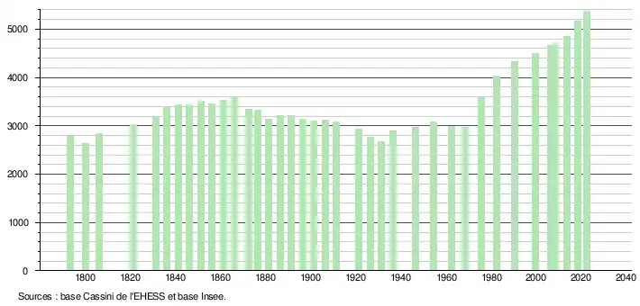 L'évolution du nombre d'habitants est connue à travers les recensements de la population effectués dans la commune depuis 1793. Pour les communes de moins de 10 000 habitants, une enquête de recensement portant sur toute la population est réalisée tous les cinq ans, les populations de référence des années intermédiaires étant quant à elles estimées par interpolation ou extrapolation[32]. Pour la commune, le premier recensement exhaustif entrant dans le cadre du nouveau dispositif a été réalisé en 2008[33].