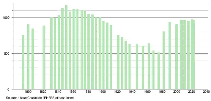 L'évolution du nombre d'habitants est connue à travers les recensements de la population effectués dans la commune depuis 1793. Pour les communes de moins de 10 000 habitants, une enquête de recensement portant sur toute la population est réalisée tous les cinq ans, les populations de référence des années intermédiaires étant quant à elles estimées par interpolation ou extrapolation[13]. Pour la commune, le premier recensement exhaustif entrant dans le cadre du nouveau dispositif a été réalisé en 2005[14].