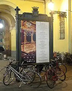 - ↑ Le théâtre Farnèse est l’œuvre de l'architecte Giovanni Battista Aleotti. Il fut inauguré le 21 décembre 1628, avec le Mercurio e Marte dont le texte était de Claudio Achillini et la musique de Monteverdi.