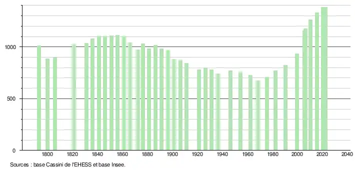 L'évolution du nombre d'habitants est connue à travers les recensements de la population effectués dans la commune depuis 1793. Pour les communes de moins de 10 000 habitants, une enquête de recensement portant sur toute la population est réalisée tous les cinq ans, les populations de référence des années intermédiaires étant quant à elles estimées par interpolation ou extrapolation[21]. Pour la commune, le premier recensement exhaustif entrant dans le cadre du nouveau dispositif a été réalisé en 2005[22].