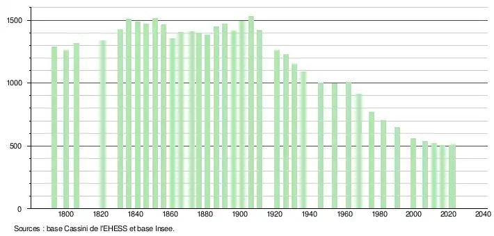 L'évolution du nombre d'habitants est connue à travers les recensements de la population effectués dans la commune depuis 1793. Pour les communes de moins de 10 000 habitants, une enquête de recensement portant sur toute la population est réalisée tous les cinq ans, les populations de référence des années intermédiaires étant quant à elles estimées par interpolation ou extrapolation[34]. Pour la commune, le premier recensement exhaustif entrant dans le cadre du nouveau dispositif a été réalisé en 2006[35].