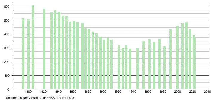 L'évolution du nombre d'habitants est connue à travers les recensements de la population effectués dans la commune depuis 1793. Pour les communes de moins de 10 000 habitants, une enquête de recensement portant sur toute la population est réalisée tous les cinq ans, les populations de référence des années intermédiaires étant quant à elles estimées par interpolation ou extrapolation[24]. Pour la commune, le premier recensement exhaustif entrant dans le cadre du nouveau dispositif a été réalisé en 2006[25].