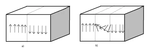 L’origine de la paroi de Bloch s’explique par le fait qu’une transition graduelle comme sur la figure b) est beaucoup moins coûteuse en énergie que la transition abrupte de la figure a).