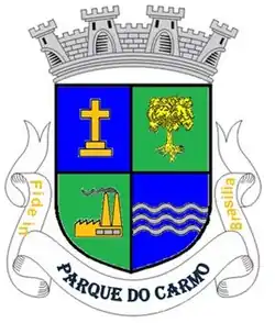Description Héraldique : Sur un champ d'azur, dans le Canton du Chef, une Croix d'or évoquant l'histoire de la formation du District avec la présence des Carmélites au XVIIIe siècle. Dans le Canton sinistre du Chef, en champ de sinople se trouve un arbre d'or, représentant l'une des plus grandes richesses de la région, le complexe écologique du Parque do Carmo. Dans le canton dextre du Contre-Chef, en sinople, un bâtiment d'or avec fenêtres et fumoirs d'argent, représentant le développement industriel de la région. Dans le Canton sinistre du Contre-Chef, en champ d'azur, des lignes ondulées d'argent, représentant les différentes rivières et sources présentes dans la région. Au-dessus des armoiries, une couronne murale d'argent avec 4 tours, représentant le statut de district de Parque do Carmo. Dans un listel d'argent, libre sur l'écu, la légende « Fide in Brasilia » (Foi au Brésil) est inscrite aux extrémités, d'azur. Et au Centre, également d'azur, la légende Parque do Carmo[6],[7].