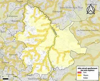 Le retrait-gonflement des sols argileux est susceptible d'engendrer des dommages importants aux bâtiments en cas d’alternance de périodes de sécheresse et de pluie. 29,5 % de la superficie communale est en aléa moyen ou fort (33,6 % au niveau départemental et 48,5 % au niveau national). Sur les 521 bâtiments dénombrés sur la commune en 2019, 100 sont en aléa moyen ou fort, soit 19 %, à comparer aux 25 % au niveau départemental et 54 % au niveau national. Une cartographie de l'exposition du territoire national au retrait gonflement des sols argileux est disponible sur le site du BRGM[19],[20].