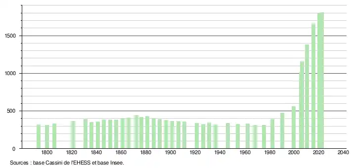 L'évolution du nombre d'habitants est connue à travers les recensements de la population effectués dans la commune depuis 1793. Pour les communes de moins de 10 000 habitants, une enquête de recensement portant sur toute la population est réalisée tous les cinq ans, les populations de référence des années intermédiaires étant quant à elles estimées par interpolation ou extrapolation[26]. Pour la commune, le premier recensement exhaustif entrant dans le cadre du nouveau dispositif a été réalisé en 2005[27].