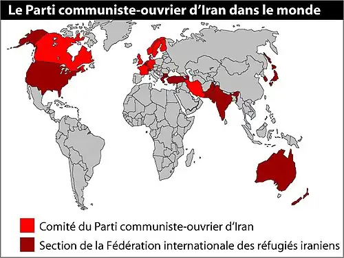 Interdit en Iran, où son organisation est clandestine, le Parti communiste-ouvrier d'Iran est également présent dans la diaspora iranienne. Il dispose officiellement de comités en Allemagne, en Angleterre, au Canada, au Danemark, en Finlande, en France, en Norvège, aux Pays-Bas et en Suède[9]. L'Organisation de la jeunesse communiste est étroitement associée au parti[10]. Un rapport du ministère fédéral de l'intérieur considère que 250 membres du parti vivaient en Allemagne en 2004[11]. La même année, son ancien président Koorosh Modaresi évoque un chiffre total de 5000 membres, dont la moitié aurait rejoint le Parti Hekmatiste[12].