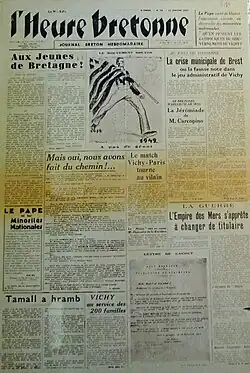 En , quelques nationalistes vendant L'Heure Bretonne sont arrêtés à Quimper (Alexandre Angeli, préfet du Finistère prononce à plusieurs reprises l'interdiction de vendre ce journal dans le Finistère, René Bousquet, sous-préfet à Lorient fait interdire l'impression de Dihunamb, la revue de Loeiz Herrieu). La presse quotidienne (La Dépêche de Brest et de l'Ouest, Le Phare de la Loire, L'Ouest-Éclair, Le Nouvelliste du Morbihan) est ralliée au gouvernement de Pétain et prend position en défendant la thèse de la restauration des provinces, qui rendra ainsi à la Bretagne une partie de ses libertés dans le cadre d'une France maternelle.
