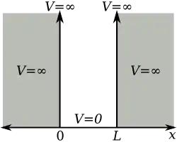 où h est la constante de Planck, m est la masse de la particule, ψ est la fonction d'onde (pouvant être complexe) que nous devons trouver, V(x) est une fonction décrivant le potentiel pour chaque valeur de x et E est l'énergie, un nombre réel. Pour le cas de la particule dans une boîte unidimensionnelle de longueur L, le potentiel est zéro à l'intérieur de la boîte, et vaut l'infini en x = 0 et x = L. Pour la région à l'intérieur de la boîte V(x) = 0 et l'équation (1) se réduit à: