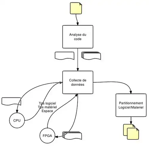 - Collecte de données : Tout l'algorithme de partitionnement est basé sur un ensemble d'informations sur les processus (temps d'exécution du logiciel, temps d'exécution du matériel, espace nécessaire. Après que le graphe des processus ait été construit, chaque processus est exécuté individuellement à la fois sur le CPU pour obtenir le temps d'exécution logiciel et sur le FPGA pour obtenir le temps d'exécution matériel et l'espace occupé.