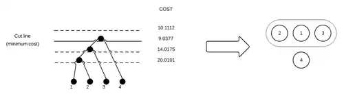Cette matrice fournit la distance entre deux objets. Après la construction de cet arbre, il est divisé en cluster (figure découpage de l'arbre de cluster) en suivant une fonction qui observe les possibilités de partage des ressources et les coûts de propagation.
