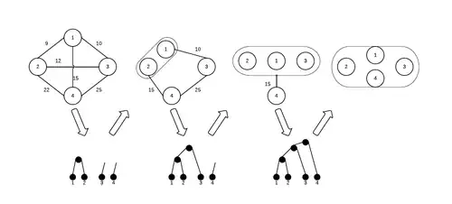 Pour avoir une idée du partitionnement logiciel/matériel, il est intéressant de se baser sur une approche où le système est décrit en Occam. Car un programme Occam est construit par la combinaison de processus primitif et qu'il est facile de les représenter. Dans ce cadre-là, pour préserver la sémantique de la description originale, le partitionnement est le résultat de l'application d'un ensemble de règles au programme. Ces règles incluent le fractionnement de la description en Occam en un ensemble de processus de communication. Une fois que le choix des processus logiciels est fait, un processus de clustering peut démarrer. Durant cette phase, il y a des règles de regroupement des processus en cluster selon leur similarité, leur coût de communication et la minimisation du coût de propagation. Le processus de clustering est guidé par une analyse de temps réalisé dans un réseau de Petri des processus[15]. L'avantage de l'utilisation d'un réseau de Petri est la possibilité d'appliquer des techniques formelles pour une analyse quantitatives et qualitatives ainsi qu'une famille de formalisme qui partagent les mêmes principes de base dans les spécifications de l'architectures utilisées permettant ainsi une étape de transformation entre les différents aspects de la conception. Le processus de partitionnement est réalisé en utilisant un algorithme à plusieurs étapes hiérarchiques de clustering. Cet algorithme construit un arbre de cluster (figure : Construction d'un arbre de cluster) en utilisant une matrice de distance.