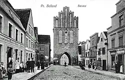 L'endroit s'appelait avant l'arrivée des chevaliers teutoniques Pazluk et comportait une maison fortifiée. Le grand-maître de l'Ordre Teutonique, Ménard de Querfurt, fait venir de Hollande en 1288 des charpentiers, des experts en construction de digues pour assainir, défricher et coloniser cette région à demi-sauvage. Une partie d'entre eux fonde le village de Holland (plus tard appelé Hollande de Prusse, Preußisch Holland en allemand) qui reçoit le statut de ville en 1297, selon les privilèges du droit de Culm. Il est spécifié dans la charte que les Hollandais sont les primi locatores de l'endroit.