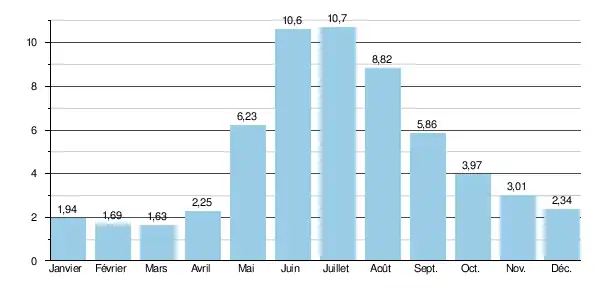 Le débit moyen mensuel observé en mars (minimum d'étiage) est de 1,63 m3/s, soit plus ou moins un septième du débit moyen du mois de juillet (10,7 m3/s), ce qui souligne l'amplitude assez modérée des variations saisonnières. Sur la durée d'observation de 50 ans, le débit mensuel minimal a été de 1,30 m3/s, tandis que le débit mensuel maximal s'élevait à 18,3 m3/s.