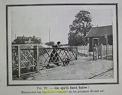 À la fin du XIXe siècle, plusieurs types de barrières existent : à palissade, à vantaux ou coulissantes. Certaines sont suffisamment faciles à manier pour pouvoir être maniées par une femme[9]. Les systèmes de fermeture varient : certaines barrières sont fermées en permanence et ne sont ouvertes qu'au passage des automobiles, tandis que d'autres ne se ferment qu'au passage des trains[9].