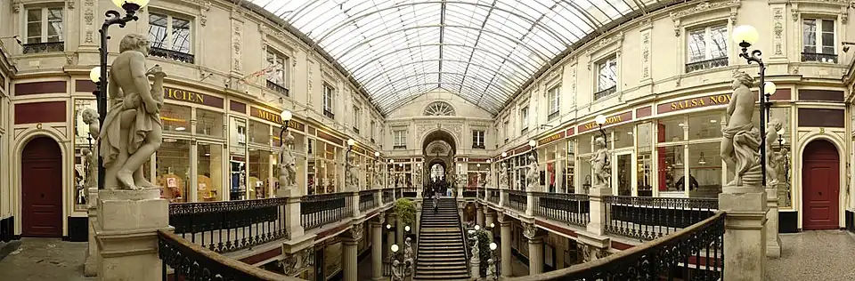Les bâtiments formant le passage comptent jusqu'à quatre étages. Pour parvenir à un éclairage satisfaisant, les architectes s'appuient sur ce qui est un symbole de l'architecture du XIXe siècle, la verrière. Les matériaux de l'époque sont le fer et le verre[31]. Du fait de la déclivité et de sa longueur, le passage présente deux bâtiments transversaux ; les trois intervalles sont couverts par des verrières différentes :